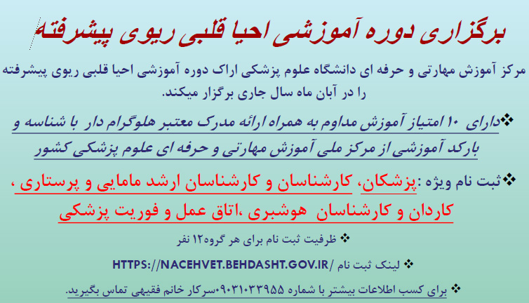 اطلاعیه برگزاری دوره آموزشی احیا قلبی ریوی پیشرفته ۰۸ مهر ۱۴۰۲ | ۱۰:۲۰ کد : ۳۷۹۸۷ اطلاعیه ارسال به دیگران نام شما ایمیل شما ایمیل دریافتکننده ارسال انصراف تعداد بازدید:۱۷۶۹۸