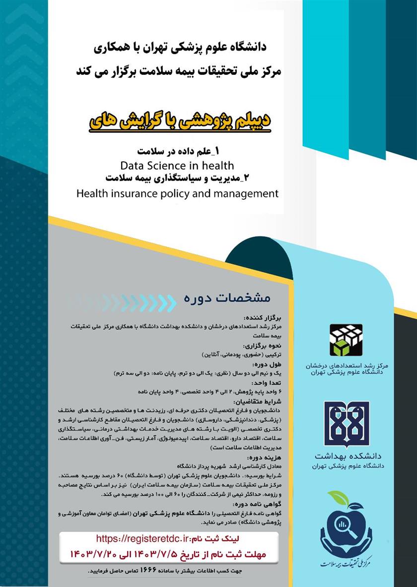 با توجه به پوشش بیمه ای بیش از نیمی از جمعیت کشور توسط سازمان بیمه سلامت ایران و حجم عظیمی از داده های خدمات سلامت این بیمه شدگان در این سازمان که منبع ارزشمندی برای تولید شواهدی علمی در تصمیمات سیاست گذاران می باشد لذا به منظور استفاده از ظرفیت دانشجویان/فارغ التحصیلان نخبه رشته های علوم پزشکی و سایر رشته ها و انجام پژوهش های بنیادی، توسعه ای و کاربردی در حوزه بیمه سلامت با استفاده از ظرفیت این سرمایه های کشور، برگزاری " دوره دیپلم پژوهشی " با همکاری دانشگاه علوم پزشکی تهران و مرکز ملی تحقیقات بیمه سلامت برنامه ریزی گردیده است.