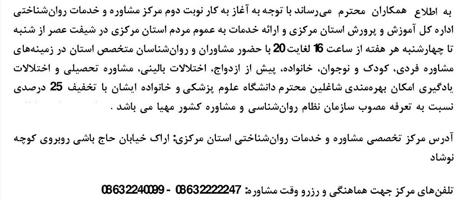 مرکز تخصصی مشاوره وخدمات روانشناختی ۱۲ آبان ۱۴۰۳ | ۱۳:۰۴ کد : ۴۷۳۷۱ اطلاعیه ارسال به دیگران نام شما ایمیل شما ایمیل دریافتکننده ارسال انصراف تعداد بازدید:۱۰۵۷۹ آغاز به کار نوبت دوم (شیفت عصر) مرکز تخصصی مشاوره و خدمات روانشناختی اداره کل آموزش و پرورش استان مرکزی و ارائه خدماات با تخفیف ۲۵ درصدی به شاغلین دانشگاه علوم پزشکی