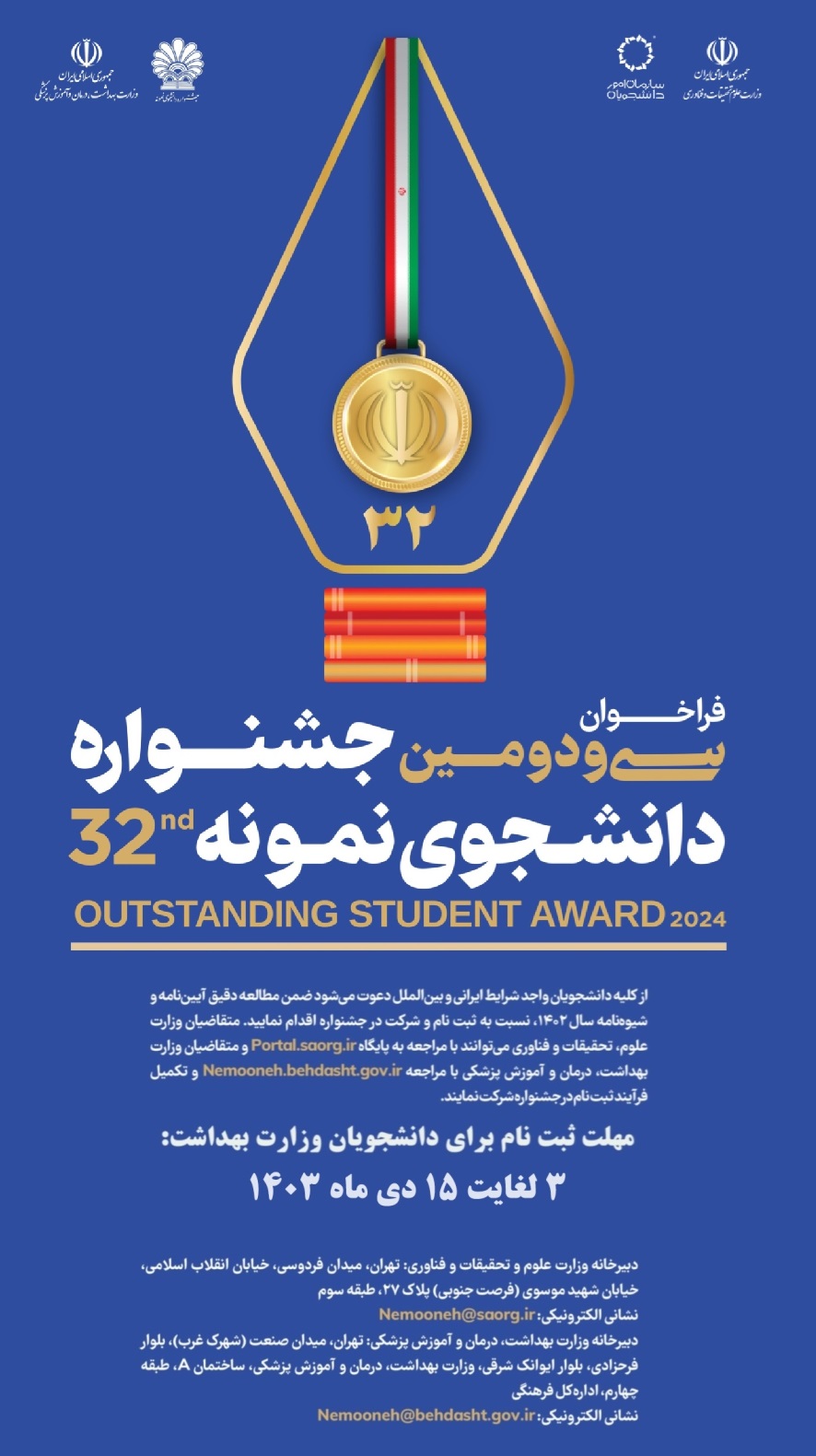 متقاضیان وزارت علوم، تحقیقات و فناوری می توانند با مراجعه به پایگاه portal.saorg.ir و تکمیل فرآیند ثبتنام در جشنواره شرکت نمایند.