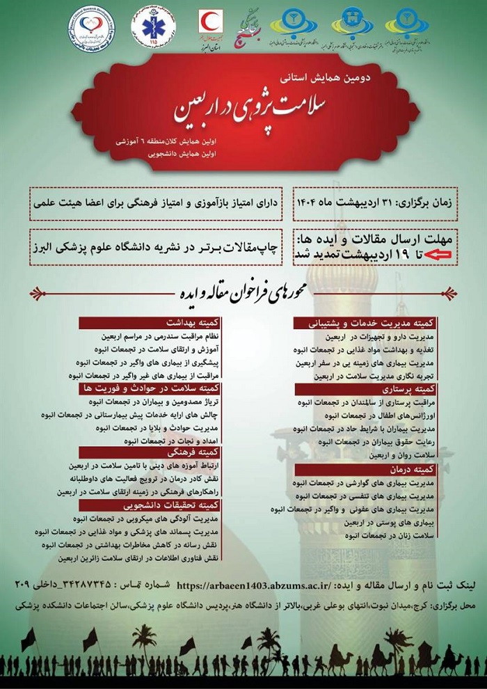 دانشگاه علوم پزشکی البرز درنظر دارد با توجه به اهمیت و ارتقاء سطح سلامت افراد شرکت کننده در تجمعات انبوه با تاکید بر راهپیمایی اربعین حسینی، دومین همایش استانی سلامت پژوهی در اربعین را در روز چهارشنبه ۳۱ اردیبهشت ماه ۱۴۰۴ برگزار نماید.