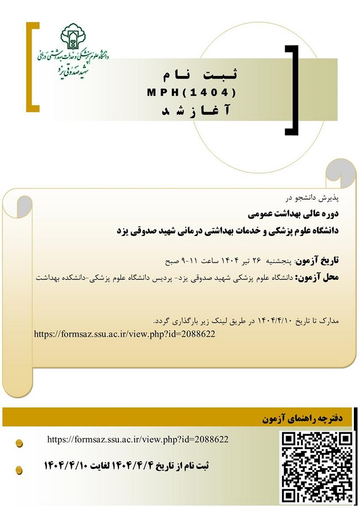 به اطلاع کلیه همکاران و دانشجویان واجد شرایط می رساند، دانشگاه علوم پزشکی شهید صدوقی یزد در نظر دارد با توجه به واگذاری برگزاری آزمون غیر متمرکز کتبی و مصاحبه پذیرش دانشجو در دوره عالی بهداشت عمومی MPH در سال تحصیلی ۱۴۰۴-۱۴۰۵ از وزارت متبوع به دانشگاه های مجری و دارای مجوز، آزمون دوره آموزش عالی بهداشت عمومی MPH گرایش مبارزه با بیماریها را برگزار نماید.