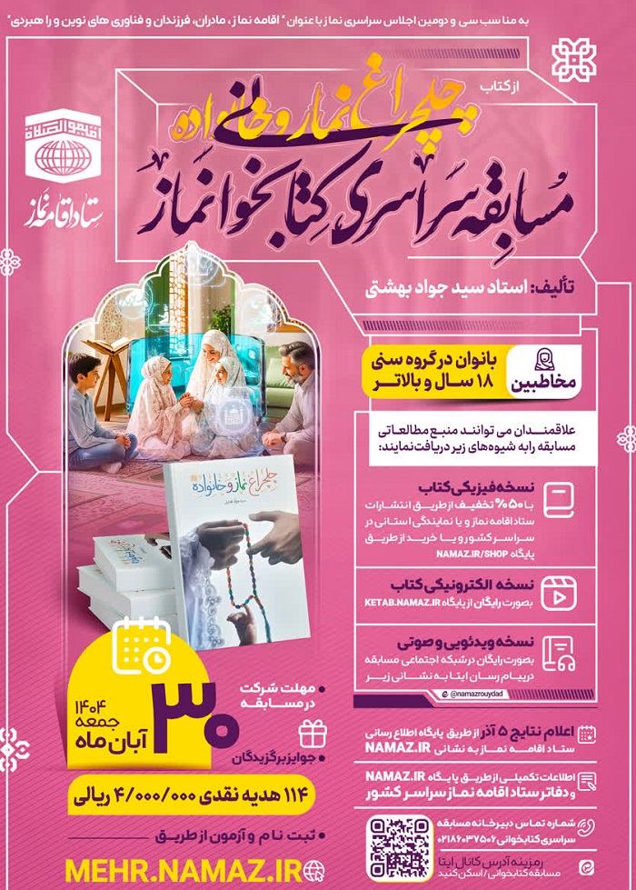 با توجه به برگزاری سی و دومین اجلاس سراسری نماز با موضوع " اقامه نماز ، مادران و فرزندان و فناوری های نوین و راهبردی " مسابقه سراسری کتابخوانی نماز از کتاب " چلچراغ نماز و خانواده " با ملاحظات ذیل برگزار خواهد شد.
