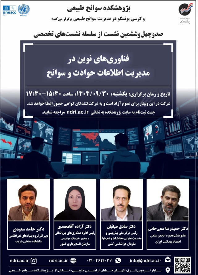 نشست فن آوری نوین در مدیریت اطلاعات حوادث وسوانح ۳۰ آذر ۱۴۰۴ | ۱۲:۰۴ کد : ۵۷۱۴۹ اطلاعیه ارسال به دیگران نام شما ایمیل شما ایمیل دریافتکننده ارسال انصراف تعداد بازدید:۱۵۸۱ دعوتنامه نشست فن آوری نوین در مدیریت اطلاعات حوادث وسوانح
