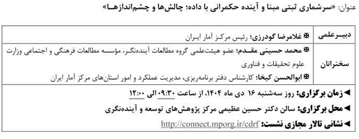 نشست علمی سرشماری ثبتی مبنا آینده حکمرانی با داده ۱۴ دی ۱۴۰۴ | ۱۰:۲۱ کد : ۵۷۴۱۸ اطلاعیه ارسال به دیگران نام شما ایمیل شما ایمیل دریافتکننده ارسال انصراف تعداد بازدید:۶۹۹ دویست وسی وهفتمین نشست علمی - تخصصی با عنوان سرشماری ثبتی مبنا آینده حکمرانی با داده، چالش ها وچشم اندازها
