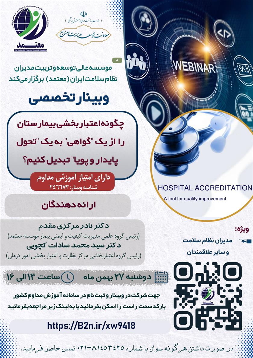 وبینار تخصصی "چگونه اعتباربخشی بیمارستان را از یک "گواهی" به یک "تحول پایدار و پویا" تبدیل کنیم؟ ۲۶ بهمن ۱۴۰۴ | ۱۲:۱۴ کد : ۵۸۰۱۱ اطلاعیه ارسال به دیگران نام شما ایمیل شما ایمیل دریافتکننده ارسال انصراف تعداد بازدید:۲۱۱ برگزاری وبینار تخصصی "چگونه اعتباربخشی بیمارستان را از یک " گواهی" به یک " تحول پایدار و پویا " تبدیل کنیم؟